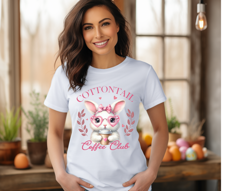 Join the Cottontail Coffee Club and celebrate Easter in style with our exclusive short sleeve tee. With a cute cottontail design, this tee is perfect for coffee lovers and holiday enthusiasts alike. Upgrade your wardrobe and caffeine fix with our high-quality and comfortable shirt.