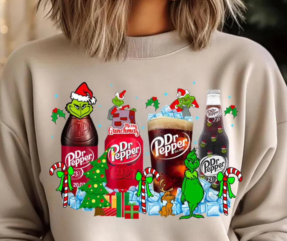 Stay cozy this holiday season with the Dr Pepper Grinch crewneck sweatshirt! Featuring a playful mashup of everyone's favorite soda and Christmas icon, this sweatshirt is the perfect addition to your winter wardrobe. Embrace the holiday spirit in quirky style. (No grinchiness allowed!)