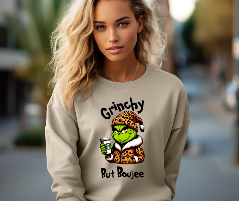 Unleash your inner Grinch with this Grinchy But Bougee crewneck sweatshirt! Perfect for those who don't take themselves too seriously, this sweatshirt adds a touch of quirkiness to any outfit. Stay cozy and stylish with this fun and playful statement piece.
