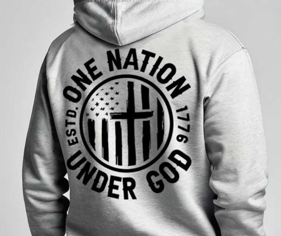 Celebrate the founding of America with our One Nation Under God Pullover Hoodie. Featuring the year 1776, this hoodie proudly showcases our country's history. Keep warm and show your patriotism with this comfortable and stylish sweatshirt. Perfect for any occasion.