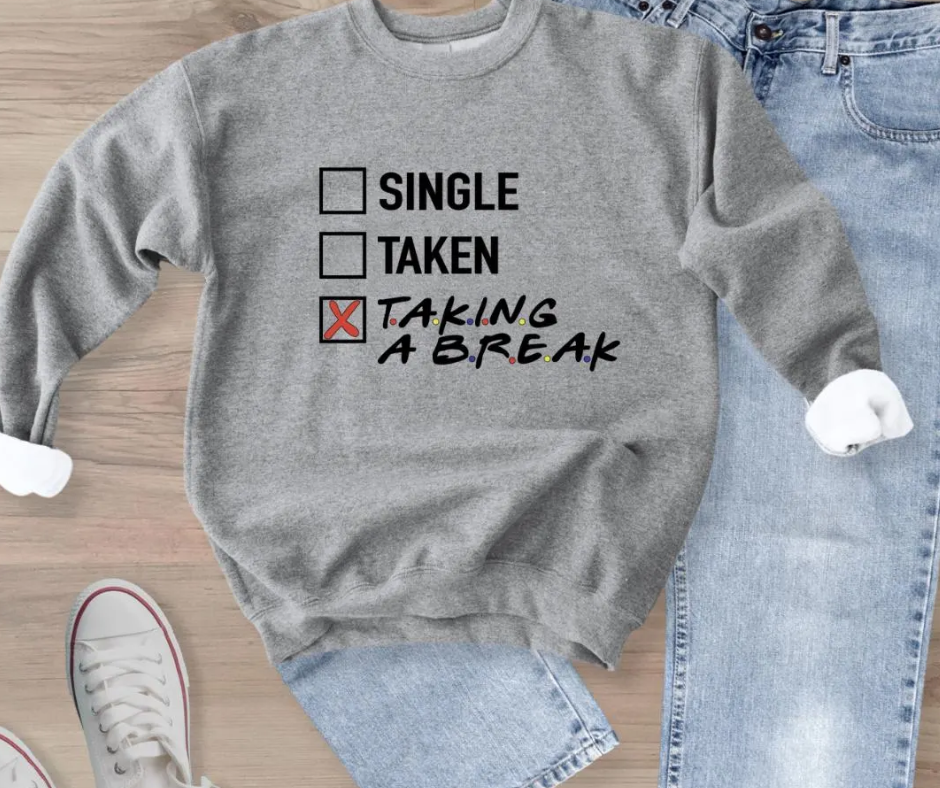 Join the trend with our Single Taken Taking a Break shirt, inspired by the iconic Friends TV show. Perfect for those who are single, taken, or just taking a break. Show off your love for the show and your sense of humor with this playful shirt.